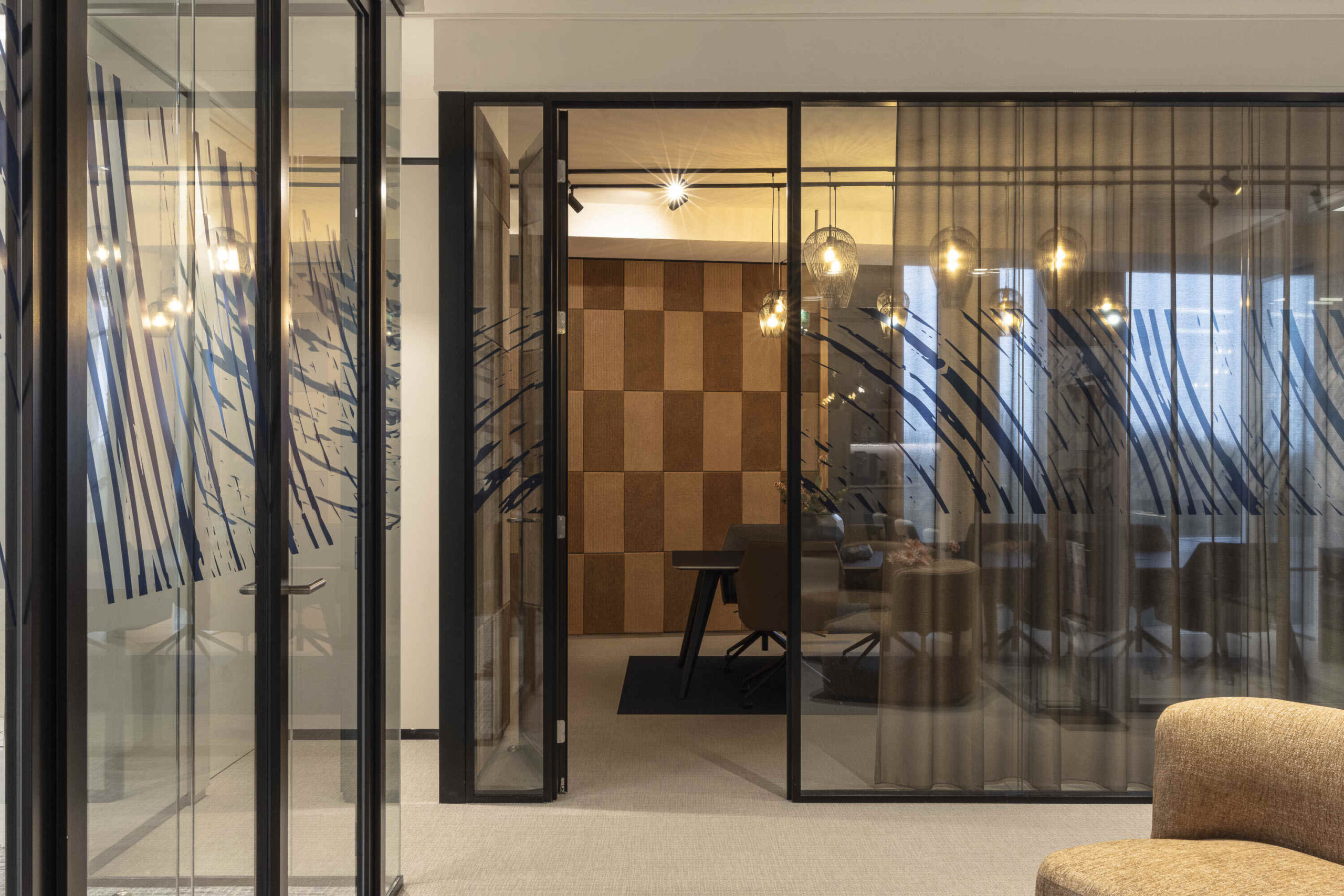 De wand brengt visuele warmte en akoestisch comfort in de ruimte, en sluit naadloos aan bij het stijlvolle interieurontwerp van NV Interiors. Zo ontstaat een rustige, prettige werkomgeving waarin design en duurzaamheid samenkomen.